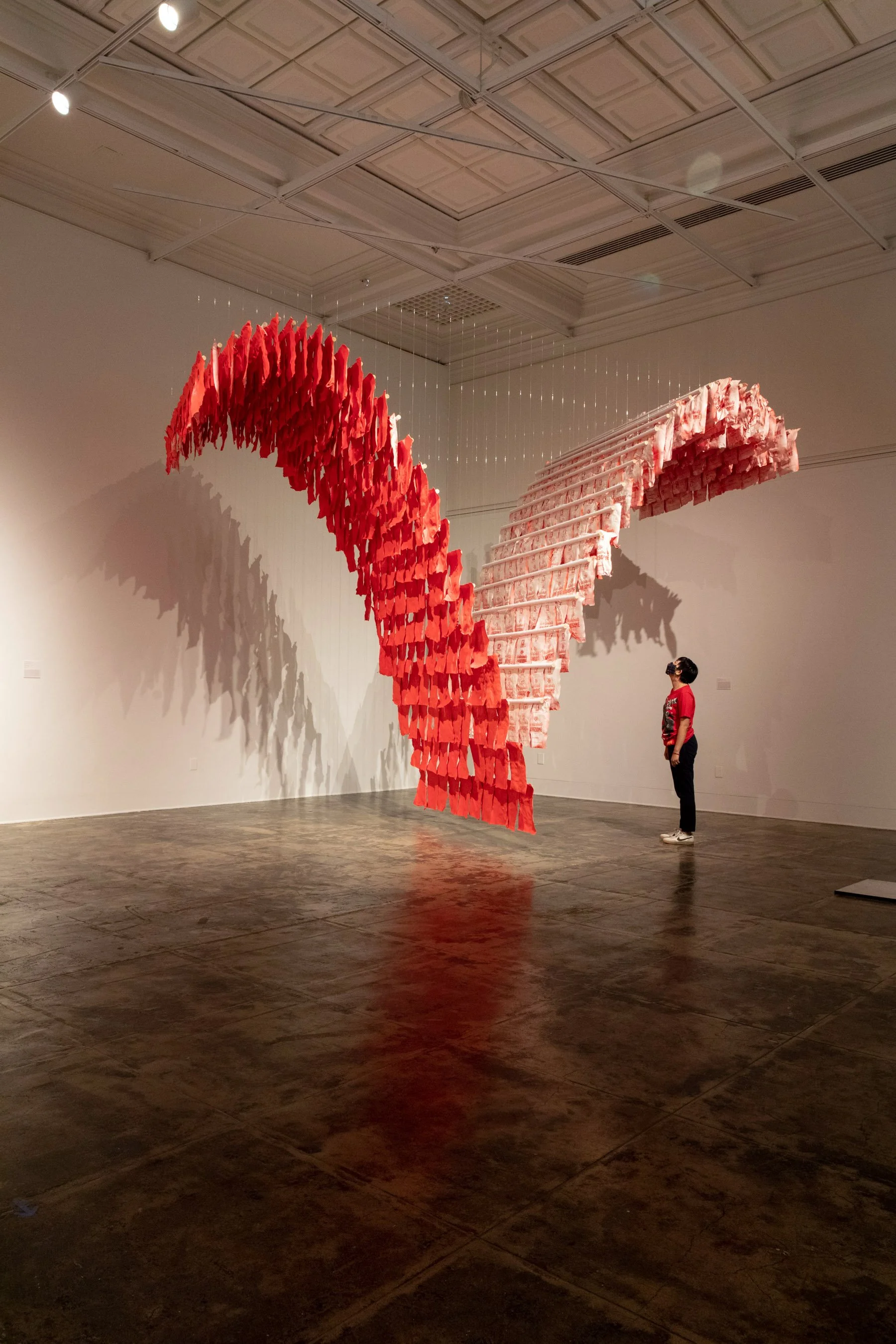 Whose Diversity, 2020, scritta paper, gel medium, acrylic paint, cotton thread, 4’x15’